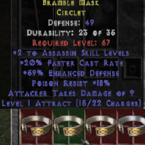 Bramble Mask Circlet +2 Assassin Skills 20 FCR 59 ED 18% PR 9 ATD 49 DEF LVL 67 REQ